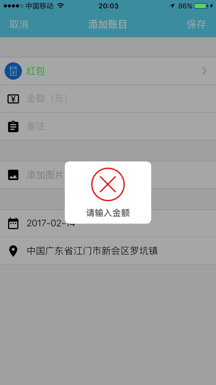 添加账目完成提示 不选择类别直接按保存会出现提示