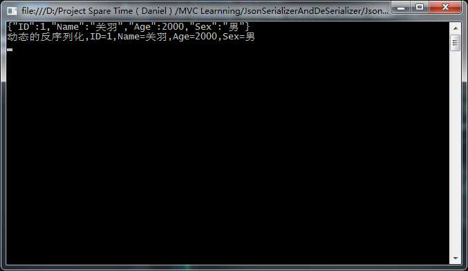 1 #region 2.JavaScriptSerializer方式实现序列化和反序列化 2 Student stu = new Student() 3 { 4 ID = 1, 5 Name = "关羽", 6 Age = 2000, 7 Sex = "男" 8 }; 9 10 JavaScriptSerializer js = new JavaScriptSerializer(); 11 string jsonData = js.Serialize(stu);//序列化 12 Console.WriteLine(jsonData); 13 14 15 ////反序列化方式一: 16 string desJson = jsonData; 17 //Student model = js.Deserialize<Student>(desJson);// //反序列化 18 //string message = string.Format("ID={0},Name={1},Age={2},Sex={3}", model.ID, model.Name, model.Age, model.Sex); 19 //Console.WriteLine(message); 20 //Console.ReadKey(); 21 22 23 ////反序列化方式2 24 dynamic modelDy = js.Deserialize<dynamic>(desJson); //反序列化 25 string messageDy = string.Format("动态的反序列化,ID={0},Name={1},Age={2},Sex={3}", 26 modelDy["ID"], modelDy["Name"], modelDy["Age"], modelDy["Sex"]);//这里要使用索引取值,不能使用对象.属性 27 Console.WriteLine(messageDy); 28 Console.ReadKey(); 29 #endregion