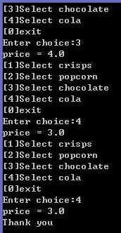 int choice,i; double price; for(i=1;i<=5;i++){ //以下5行显示菜单 printf("[1]Select crisps\n"); //查询薯片价格 printf("[2]Select popcorn\n"); //查询爆米花价格 printf("[3]Select chocolate\n"); //查询巧克力价格 printf("[4]Select cola\n"); //查询可乐价格 printf("[0]exit\n"); //退出查询 printf("Enter choice:"); scanf("%d",&choice); if(choice == 0) //如果输入为0,则提前结束循环 break; switch(choice){ case 1:price = 3.0;break; case 2:price = 2.5;break; case 3:price = 4.0;break; case 4:price = 3.0;break; default:price = 0.0;break; } printf("price = %0.1f\n",price); } printf("Thank you\n"); return 0;