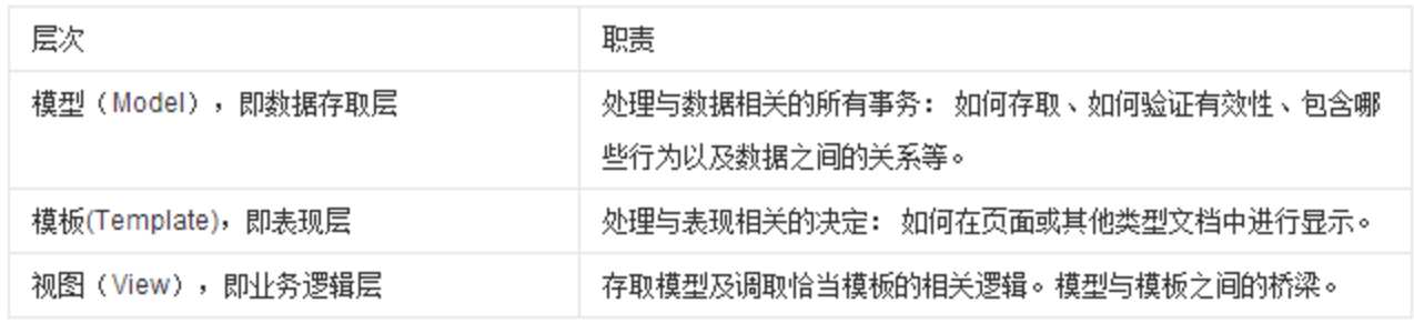 Django是一个基于MVC构造的框架。但是在Django中,控制器接受用户输入的部分由框架自行处理,所以Django里更关注的是模型(Model)、模板(Template)和视图(Views),称为MTV模式。它们各自的职责如下: