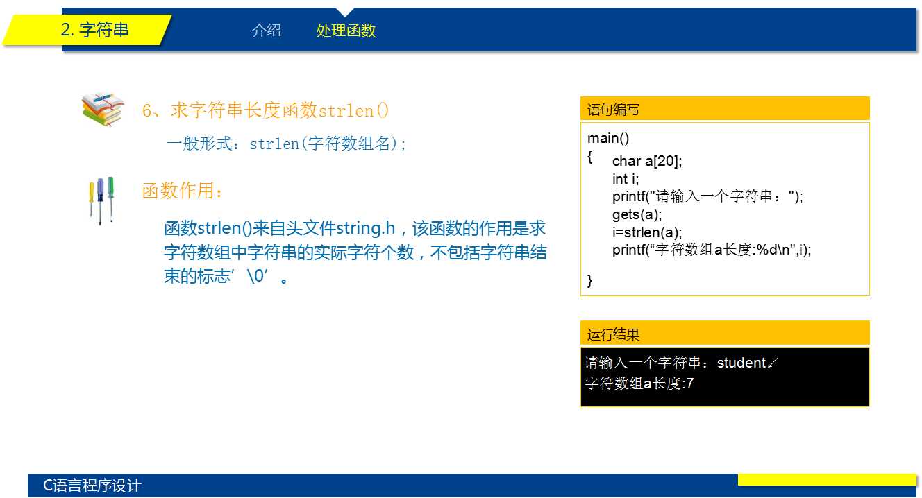 main() { char a[20]; int i; printf("请输入一个字符串:"); gets(a); i=strlen(a); printf(“字符数组a长度:%d\n",i); }