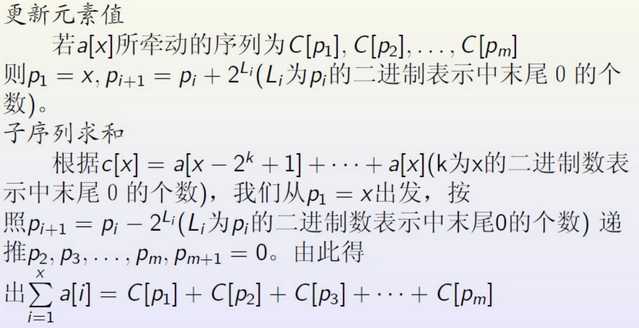 对于维护的序列A,定义C[i]=A[j+1]+...+A[i],其中j为i的二进制表示中把最右边的1换成0的值。j的值可以通过lowbit求出,即i-lowbit(i)。