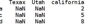 1 states=[‘Texax‘,‘Utah‘,‘california‘] 2 frame.reindex(columns=states)