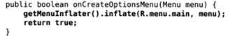 3)在需要显示菜单的activity中建立onCreateOptionsMenu()方法进行加载上述的文件,