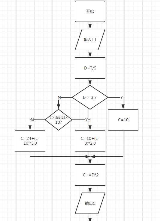 第一步:将题目要求输入的行驶里程L定义为要求输入的浮点数以满足”精确到小数点后1位“、等待时间T定义为要求输入的整形以满足”整数“,将题目要求输出的电费C定义为浮点数以满足“结果保留两位小数”
