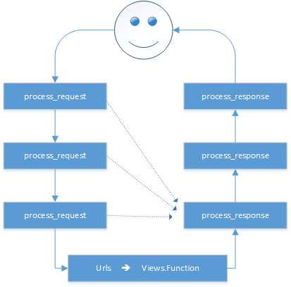 当用户发起请求的时候会依次经过所有的的中间件,这个时候的请求时process_request,最后到达views的函数中,views函数处理后,在依次穿过中间件,这个时候是process_response,最后返回给请求者。