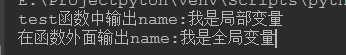 1 name=‘我是全局变量‘ 2 def test(): 3 name=‘我是局部变量‘ 4 print(‘test函数中输出name:%s‘ % name) 5 return 0 6 7 test() 8 print("在函数外面输出name:%s" % name)