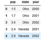 data = {‘state‘: [‘Ohio‘, ‘Ohio‘, ‘Ohio‘, ‘Nevada‘, ‘Nevada‘],
