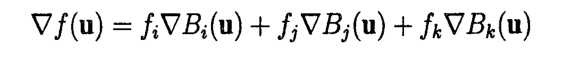 函数Bi,Bj,Bk满足Bi(u) + Bj(u) + Bk(u) = 1,所以Bi(u) + Bj(u) + Bk(u)的梯度等于0,所以 f 的梯度可表示为