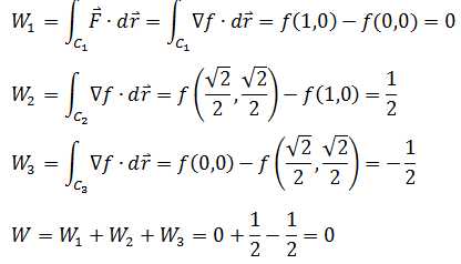 上一章花了比较大的力气计算总功,有了基本定理,就可以使计算简化。很容易看出,F = yi + xj是一个梯度场,它的势函数是f = xy,所以: