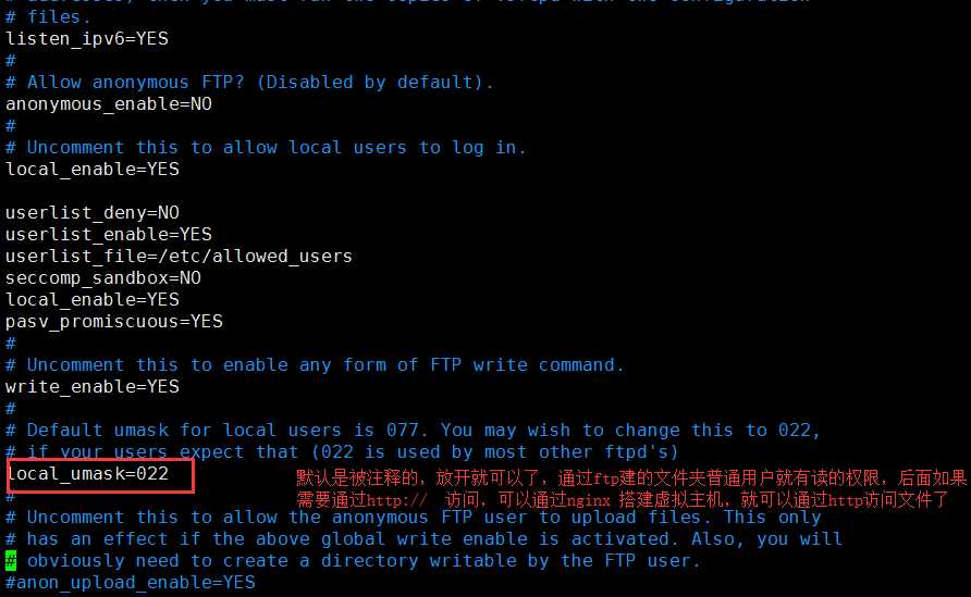 坑2 :如果想通过ftp传上去的文件可以通过 nginx 虚拟主机 http:// 可以访问到, 还需要在 vsftpd.conf 做修改 ---> sudo vi /etc/vsftpd.conf 打开 文件