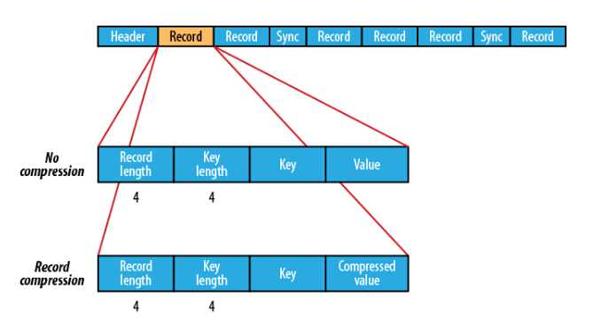 Record结构中包含Record长度、key长度、key值和value值。Sync充斥在Record之间,其作用主要是用于文件位置定位,具体定位方式是:如果提供的文件读取位置不是记录的边界可能在一个Record中间,在实际定位时会定位到所提供位置处之后的第一个Sync边界位置,并从该Sync点往后读相应长度的数据,如果提供的读取位置往后没有Sync边界点,则直接跳转文件末尾;如果提供的文件读取位置是Record边界,则直接从该位置开始读取指定长度的数据。另一种文件定位方式是seek, 这种方式则要求所提供的读取位置是record的边界位置,不然在读取迭代读取下一个位置时会出错。