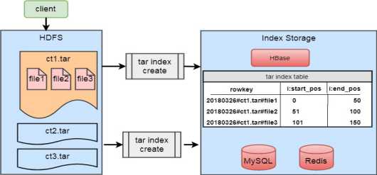 这种方案是目前兄弟部门正在使用的一个小图片存储方案,也是基于HDFS存储实际图片,基于HBase存储元数据信息。这个方案中,主要也是基于压缩的思路,将多个小图上片压缩成一个tar文件存放至HDFS上,通过HBASE记录文件名和HDFS文件的位置映射关系,架构示意图如下: