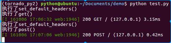 class IndexHandler(RequestHandler): def initialize(self): print "调用了initialize()" def prepare(self): print "调用了prepare()" def set_default_headers(self): print "调用了set_default_headers()" def write_error(self, status_code, **kwargs): print "调用了write_error()" def get(self): print "调用了get()" def post(self): print "调用了post()" self.send_error(200) # 注意此出抛出了错误 def on_finish(self): print "调用了on_finish()"