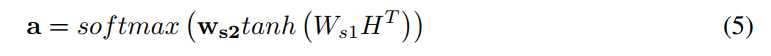 为了将变长的句子,编码为固定长度的 embedding。我们想通过选择 n 个 LSTM hidden states 的线性组合,来达到这一目标。计算这样的线性组合,需要利用 self-attention 机制,该机制将 lstm 的所有隐层状态 H 作为输入,并且输出为一个向量权重 a: