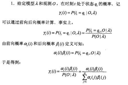 对于给定隐马尔可夫模型和观测序列O,在 t 时刻处于状态 qi 的概率gamma(i) 为: