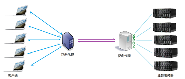 通常情况下,我们在实际项目操作时,正向代理和反向代理很有可能会存在在一个应用场景中,正向代理代理客户端的请求去访问目标服务器,目标服务器是一个反向单利服务器,反向代理了多台真实的业务处理服务器。具体的拓扑图如下: