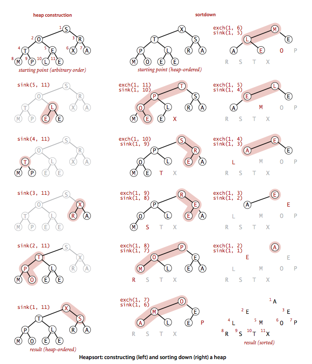 堆顺序大概就是指父母节点的值不比孩子小,然后一层一层从左到右放数组里。另外,数组从下标 1 开始,这样就可以很方便的在堆里上下移动:下标为 k 的节点的父母下标为 k/2,孩子是 2k 和 2k+1,完全不需要其它显式的连接。