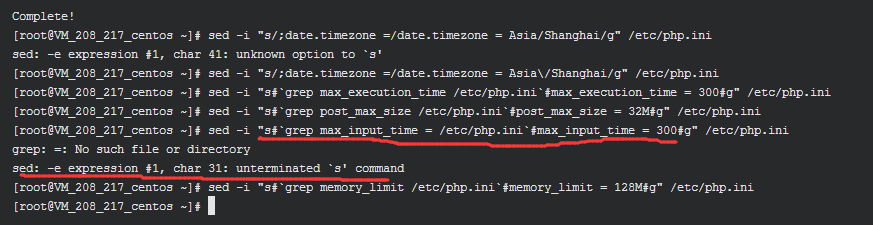 sed -i "s/;date.timezone =/date.timezone = Asia\/Shanghai/g" /etc/php.ini sed -i "s#`grep max_execution_time /etc/php.ini`#max_execution_time = 300#g" /etc/php.ini sed -i "s#`grep post_max_size /etc/php.ini`#post_max_size = 32M#g" /etc/php.ini sed -i "s#`grep max_input_time = /etc/php.ini`#max_input_time = 300#g" /etc/php.ini sed -i "s#`grep memory_limit /etc/php.ini`#memory_limit = 128M#g" /etc/php.ini