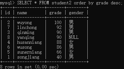举例1:查出student2表中的所有记录,并按照grade字段进行升序排序