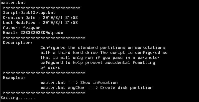 @echo off if not "%OS%"=="Windows_NT" goto END if "%1"=="" (set INFO=echo && set SEXIT=1) else (set INFO=rem && set SEXIT=0) %INFO% ******************************* %INFO% Script:Disk1Setup.bat %INFO% Creation Date : 2019/3/1 21:52 %INFO% Last Modified : 2019/3/1 21:53 %INFO% Author: feiquan %INFO% Email: 2283320260@qq.com %INFO% ********************************* %INFO% Description: %INFO% Configures the standard partitions on workstations %INFO% with a third hard drive.The script is configured so %INFO% that is will only run if you pass in a parameter %INFO% safeguard to help prevent accidental foamtting %INFO% of disks %INFO% ********************************* %INFO% Examples: %INFO% master.bat ===^> Show infomation %INFO% master.bat anyChar ===^> Create disk partition %INFO% ********************************* if "%SEXIT%"=="1" goto END @title "Configuring Disk 1..." REM cls color 07 Rem Connect $IPC net use H: \\remote-computer\shareFile REM shareFile diskpart /s H:\Disk\disk1config.txt :END echo Exiting.......