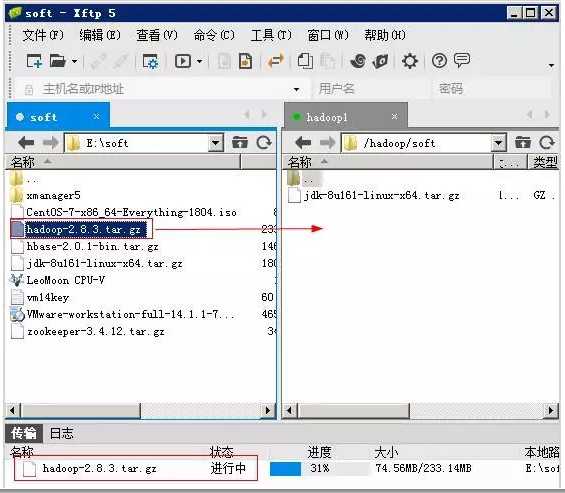 将Hadoop软件包上传至节点1:利用Xftp将物理机上的hadoop-2.8.3.tar.gz传输至节点1上(/hadoop/soft)目录下。