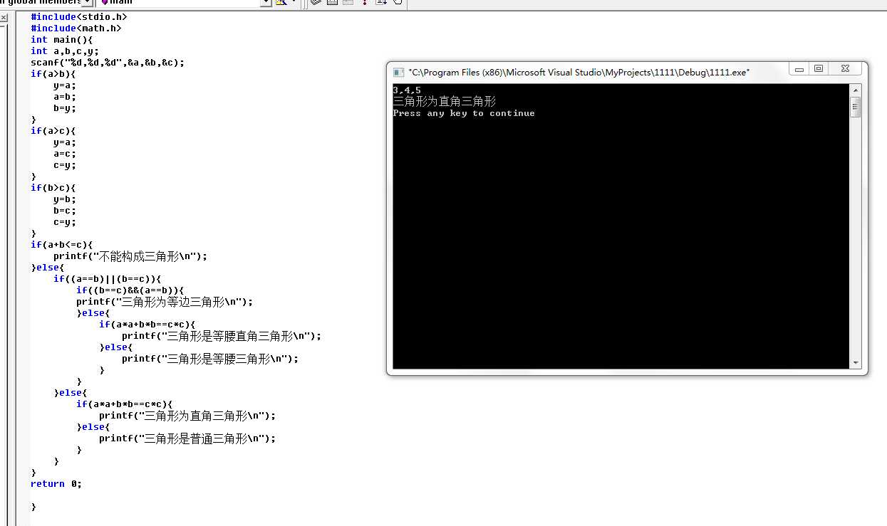 }else{ if(a*a+b*b==c*c){ printf("三角形为直角三角形\n");
