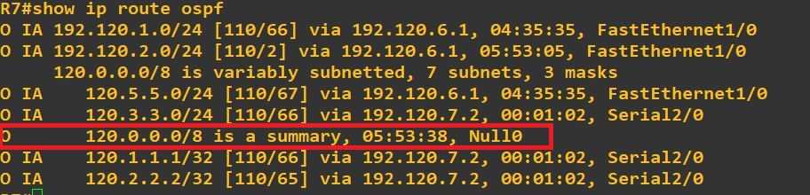 R7(config-router)#summary-address 120.0.0.0 255.0.0.0 配置外部自治系统路由汇总