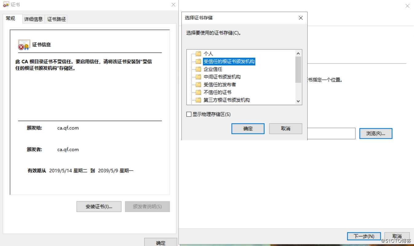 /etc/pki/CA/cacert.pem就是生成的自签名证书文件,使用 SZ/xftp工具将他导出到窗口机器中。然后双击安装此证书到受信任的根证书颁发机构