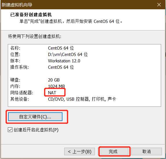 注意:点击自定义硬件可以设置硬盘大小和网络适配器,NAT就是虚拟机通过宿主机的网络来访问网络(地位是依赖于宿主机),桥接模式就是虚拟机通过外部的路由器访问网络(地位和宿主机是平行的)