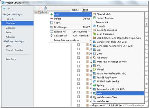 还是在Moduls操作,在中间区域的项目上右键添加相应程序框架的配置。