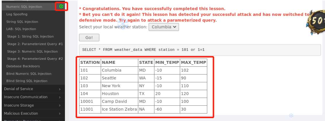 Injection Flaws-Numeric SQL Injectioninspect Element审查网页元素对源代码value="101"进行修改,在城市编号101后面添加or 1=1
