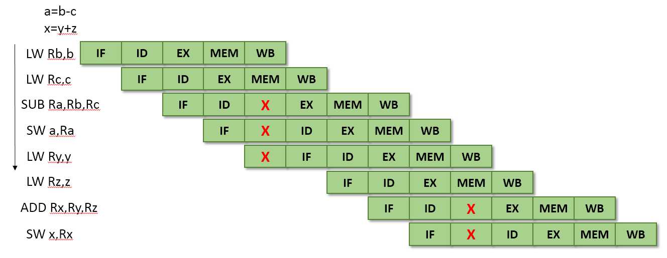 右边是流水线的情况,注意到有两个红叉,表示流水线在这里停顿,原因是数据没有准备好,如第三条ADD在等待寄存器R2的值。由于ADD的停顿,后面所有的指令都要慢一拍。