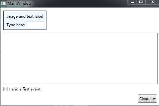 如果在任何位置将PreviewKeyDown事件标记为已处理,则冒泡的KeyDown事件也就不会触发。当勾选了Handle first event 复选框时,当在输入框中按下一个键时,listbox中显示的记录只有1条记录,因为窗口触发的PrevieKeyDown事件处理已经把隧道路由事件标识为已处理,所以PreviewKeyDown事件将不会向下传递,所以此时只会显示一条MainWindow触发的记录。并且,此时,你可以注意到,我们按下的键上对应的字符并没有在输入框中显示,因为此时并没有触发Textbox中的KeyDown事件,因为改变文本框内容的处理是在KeyDown事件中处理的。具体的运行结果如下图所示: