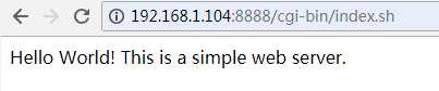 echo "Hello World! This is a simple web server."现在可在物理主机访问 http://192.168.1.104:8888/cgi-bin/index.sh 如果显示下图则说明 web 网站已经搭建成功