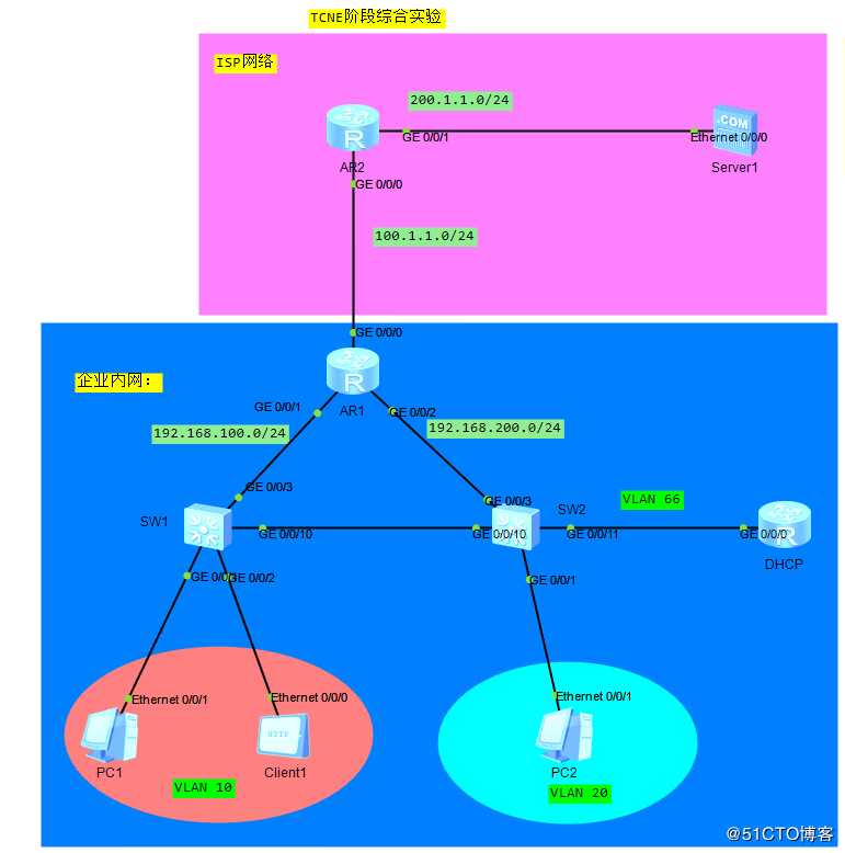 1.PC1和Client1在vlan 10,PC2在vlan 20,DHCP服务器在vlan 66;