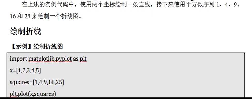 #coding:utf-8 import matplotlib.pyplot as plt x = [1,2,3,4,5] y = [1,4,9,16,25] #调用绘制的plot方法 plt.plot(x, y) #两个点的x和y写在一起 #显示绘制的图 plt.show()