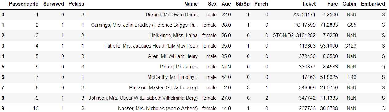 import pandas # 读取数据集 titanic = pandas.read_csv(‘titanic_train.csv‘) titanic.head(10)