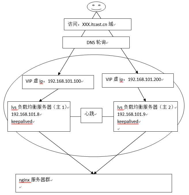 上边主备方案是当前只有一台lvs工作,这造成资源浪费,可以采用双主结构,让两台lvs当前都进行工作,采用dns轮询方式,当用户访问域名通过dns轮询每台lvs,双主结构需要两个vip,这两个vip要绑定域名。