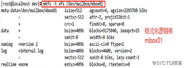 接着给建好的逻辑卷mbox01、mbox02格式化,以下为01格式化命令,02格式化方法雷同