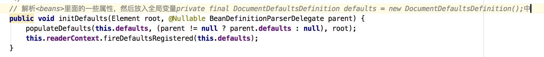 能看到有个populateDefaults方法,defaults全局变量是DocumentDefaultsDefinition defaults = new DocumentDefaultsDefinition();这个类包含了最外层<beans>的一些属性,关键还是看下populateDefaults方法,如图4:
