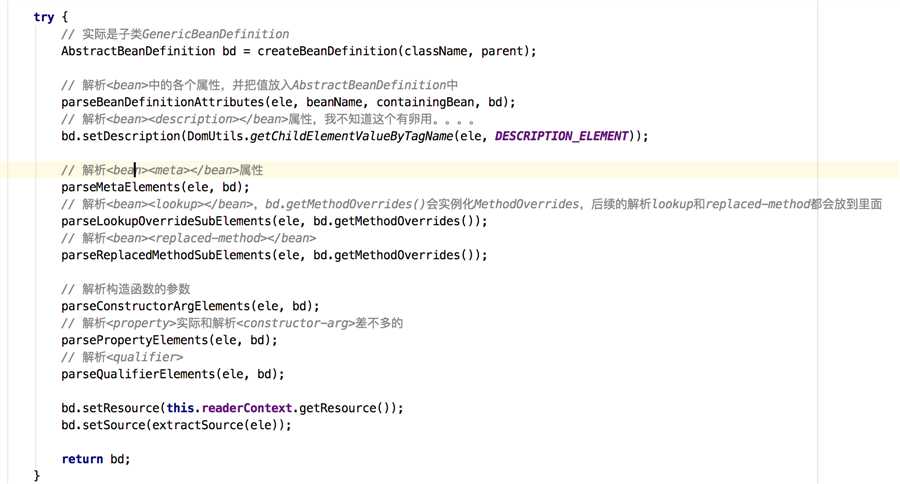 很明确就是解析四个标签:<import>、<bean>、<aliias>、<beans>,先来看下在复杂也最繁琐的解析<bean>吧,如图10: