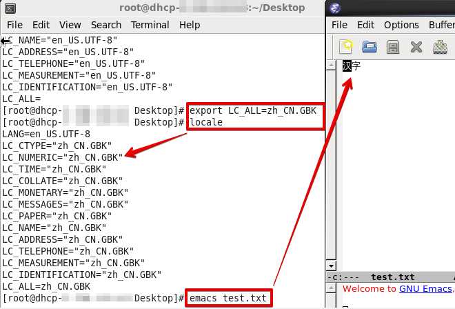 将前述内容为“汉字”的文件test.txt拷贝至Linux下,用Emacs打开: