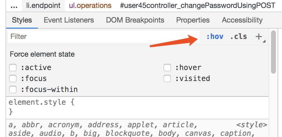1.单击上图中的 :hov 按钮会出来 force element state。然后打钩就可以了。
