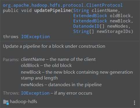 6.5 复制完成后并重新pipeline,输出流调用ClientProtocol的updatePipeline方法,更新NameNode中的元数据。