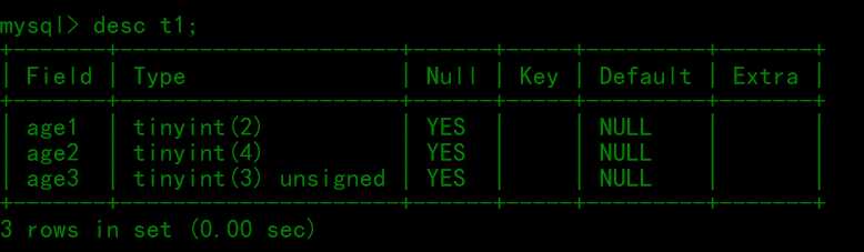 create table t1(age1 tinyint(2),age2 tinyint,age3 tinyint unsigned);