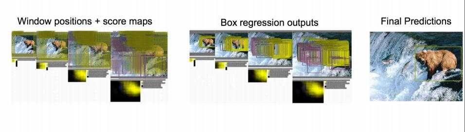 对一张图片,用各种大小的框(遍历整张图片)将图片截取出来,输入到CNN,然后CNN会输出这个框的得分(classification)以及这个框图片对应的x,y,h,w(regression)。