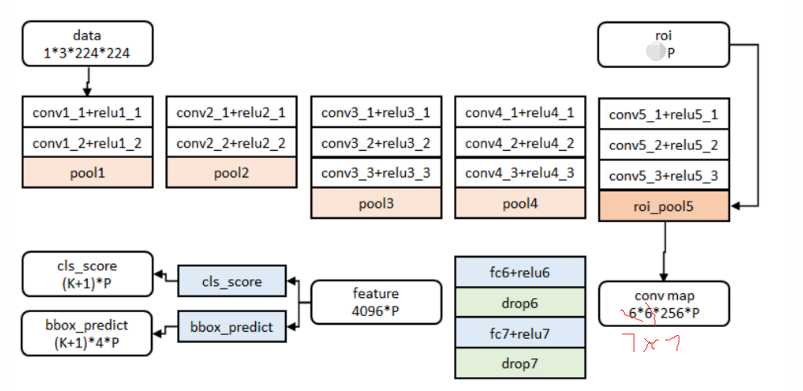 - 进入RoI Pooling层,该层的输入是conv5层的输出和P个候选区域region proposal。