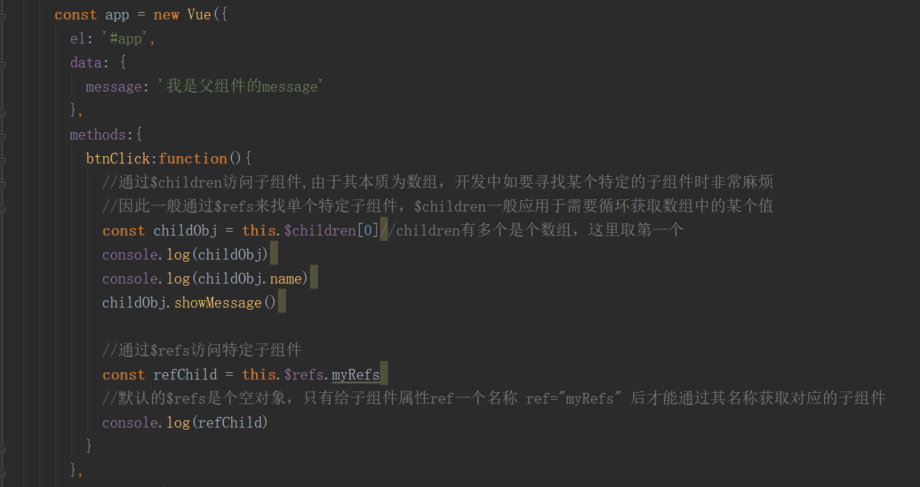 注意:通过$children访问子组件,由于其本质为数组,开发中如要寻找某个特定的子组件时非常麻烦。因此一般通过$refs来找单个特定子组件,$children一般应用于需要循环获取数组中的某个值