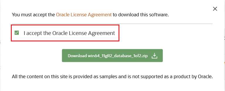 然后会弹出如下提示框,点击红框内的“我接受Oracle许可协议”然后点击绿色按钮下载